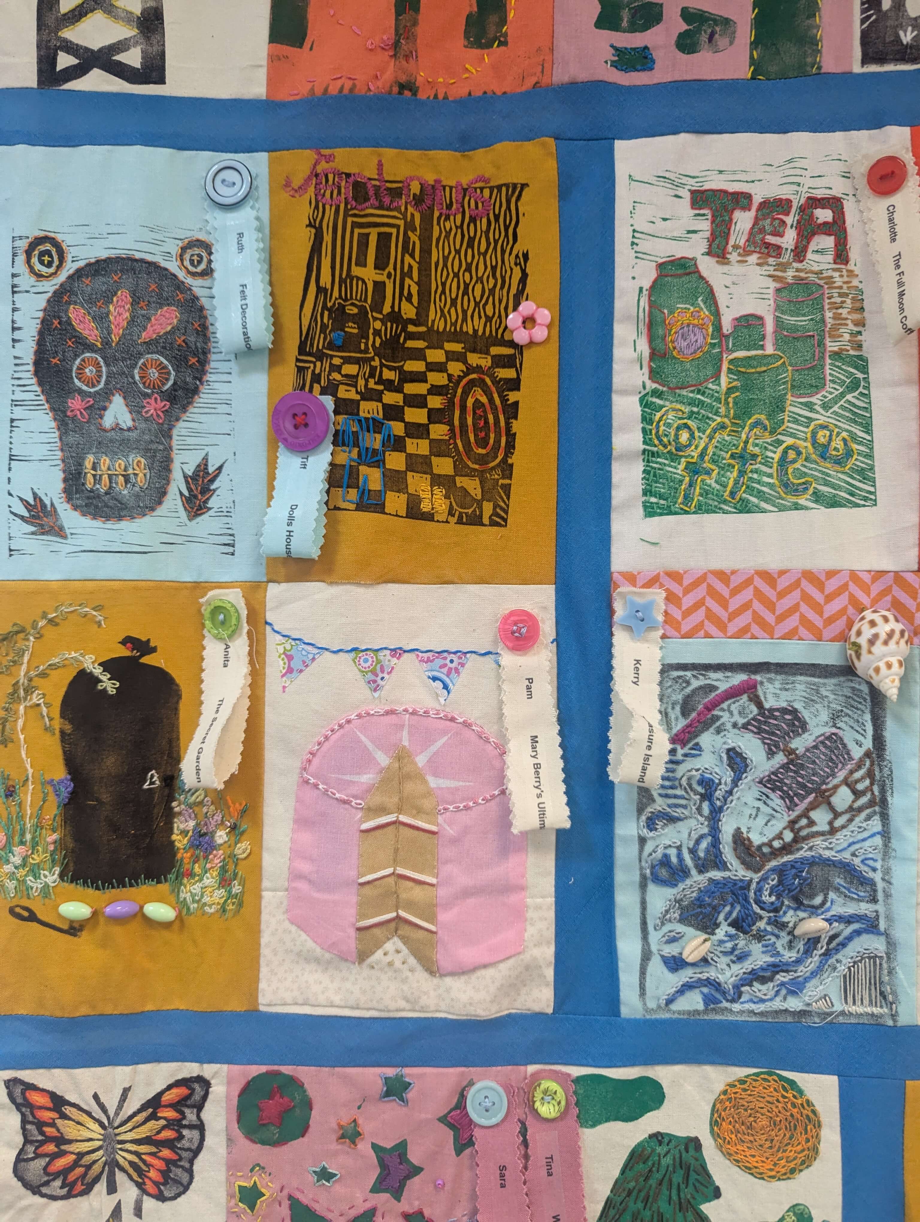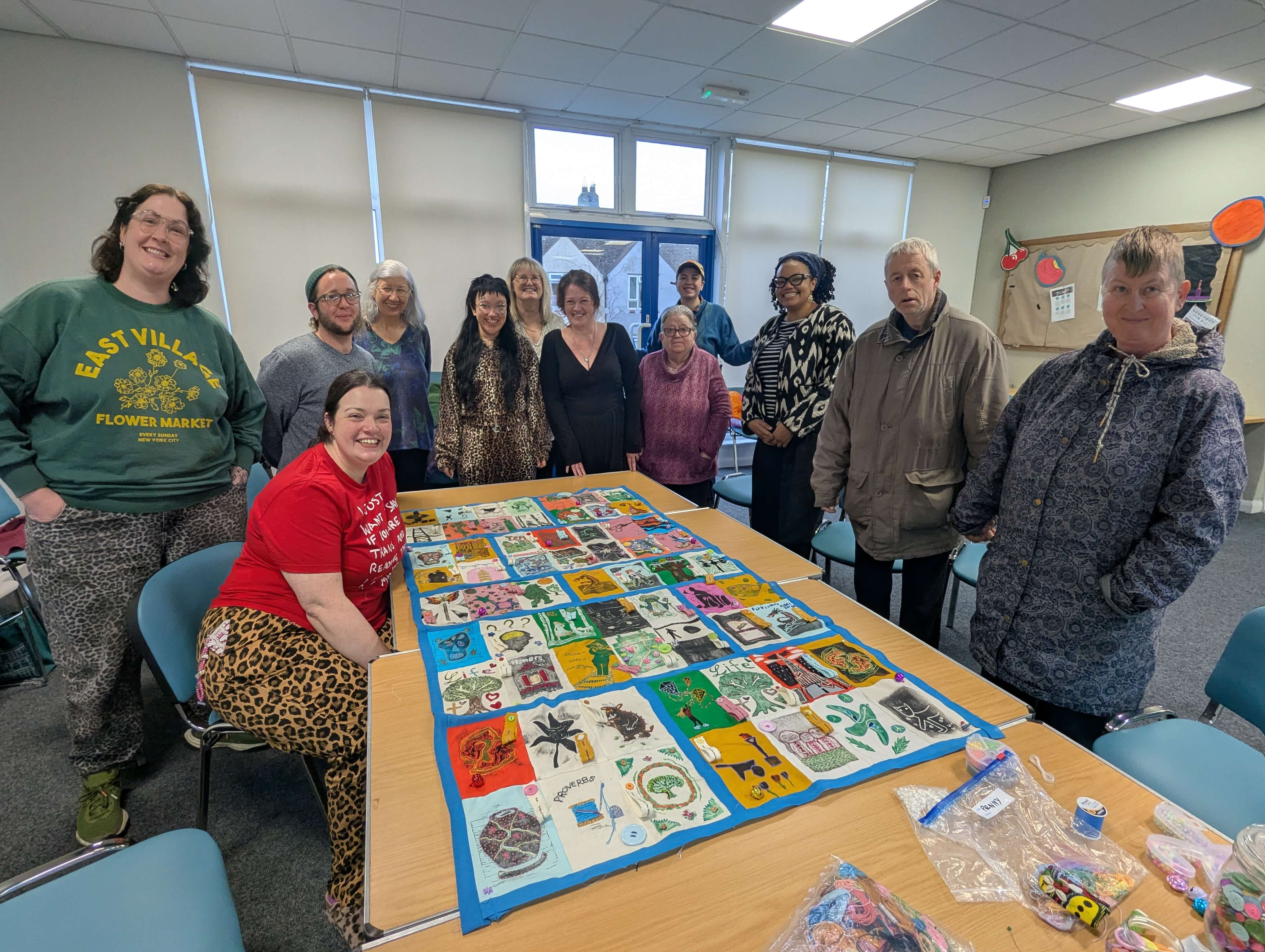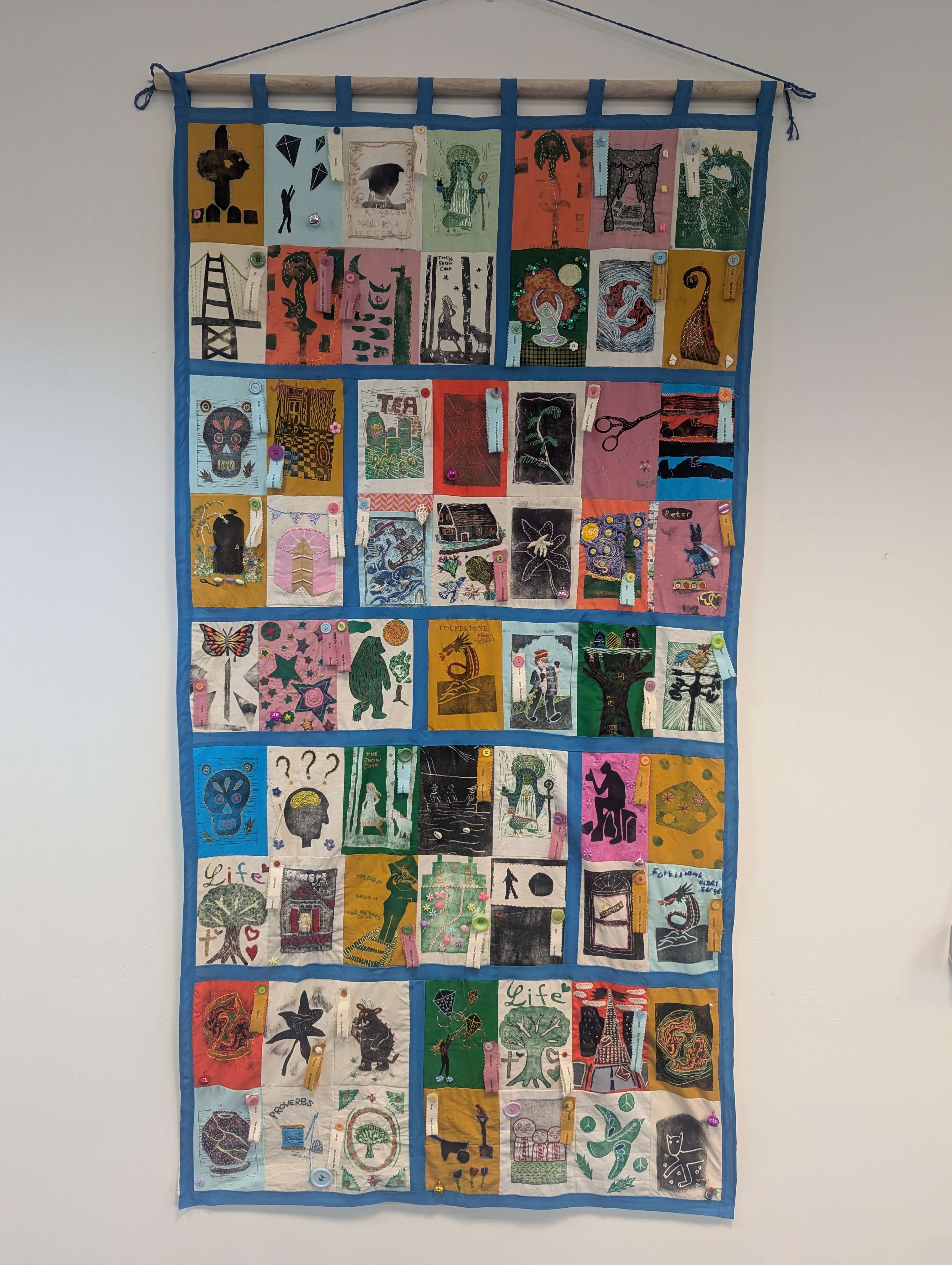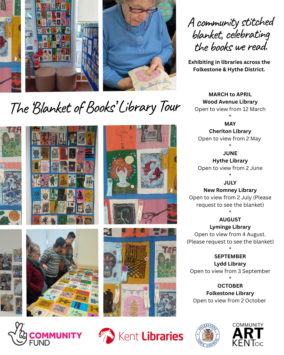 A community Print and Stitch project funded by the National Lottery Community Fund bringing people together to explore books, connect with reading, learn about library services and reduce social isolation. Fifty-six books inspired the creation of sixty-three panels, produced by community members from East Folkestone to Romney Marsh. Each panel was stitched together to make the blanket which is currently on tour at Libraries across the Folketsone & Hythe district, celebrating National Year of Reading 2026.