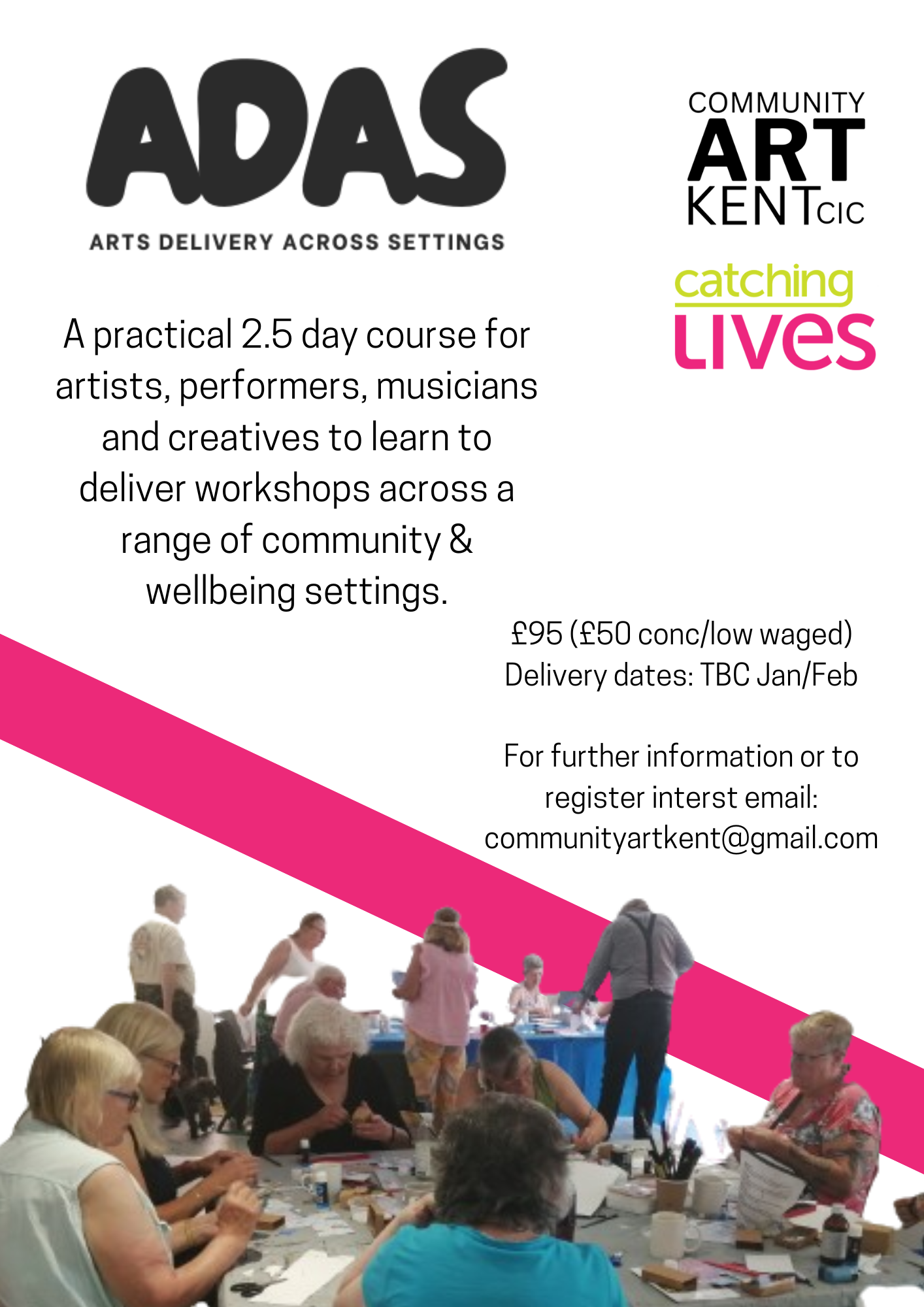 Our ADAS (Arts Delivery Across Settings) course is a tailor made course developed in partnership with Catching Lives (a charity for those vulnerably housed and using the arts to engage people in Canterbury). Our ADAS courses are specifically for artists, performers, creatives & musicians working in participatory arts, community arts and creative health. This two day training is a useful introduction to anyone entering the field.